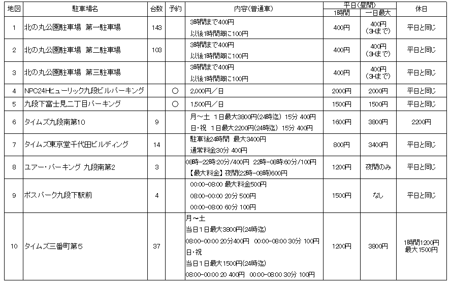 次は、北の丸公園に近い周辺駐車場を表にしてまとめてみました。